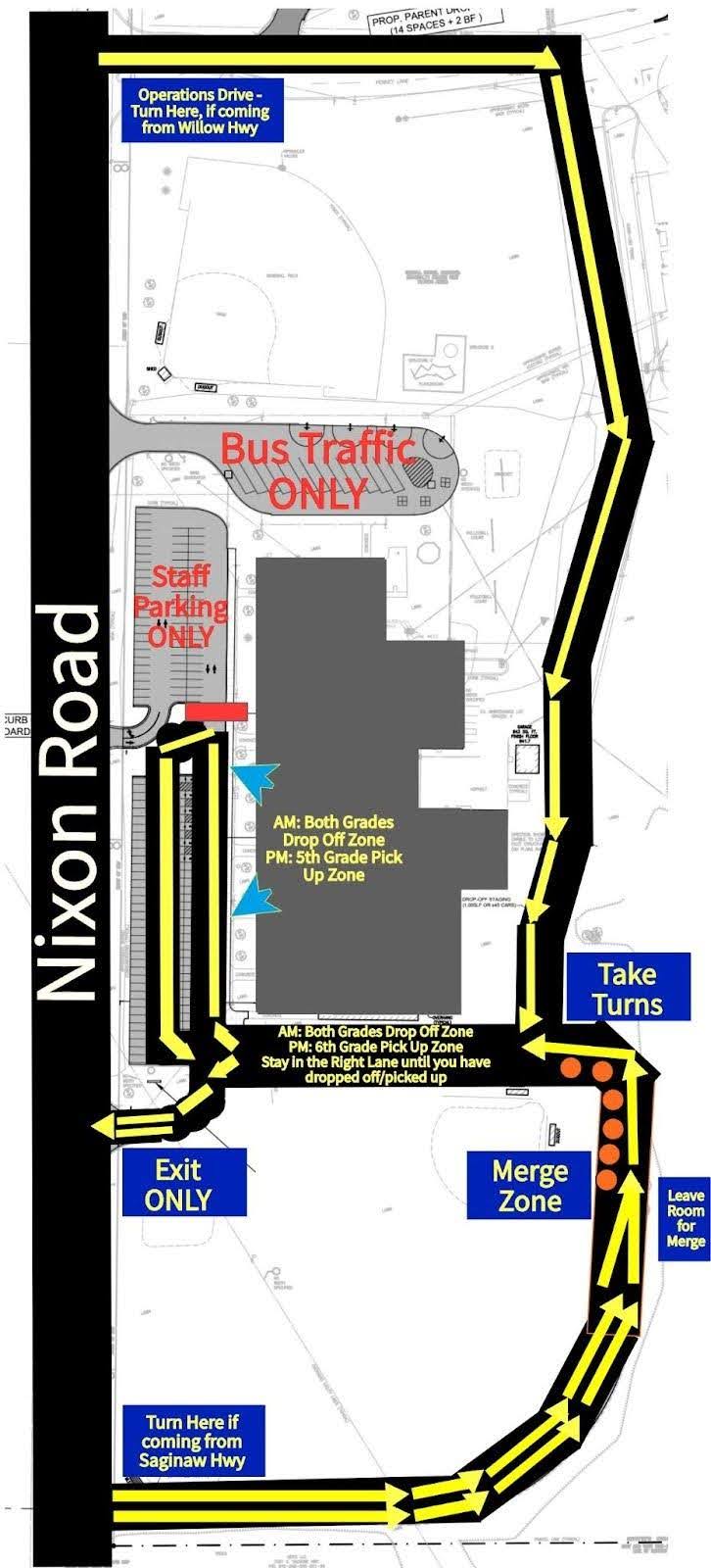 For families coming from the south - Saginaw Highway - continue to enter campus from the new South Driveway that loops around the practice field. Use both lanes until directed to merge, using a zipper merge. Signage and cones will mark the merge location. If you are in the right lane leave room for merging cars. Every other car should take turns in the merge zone.
